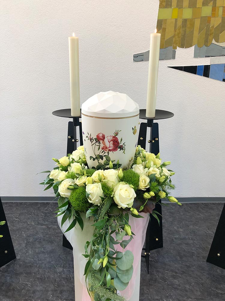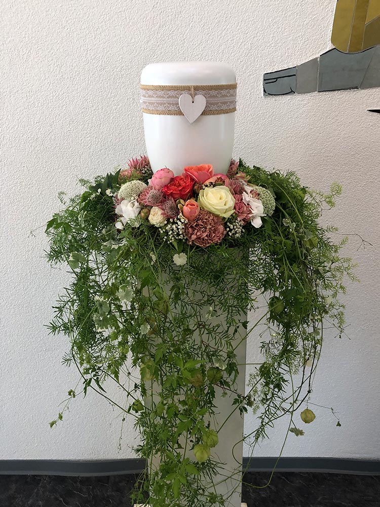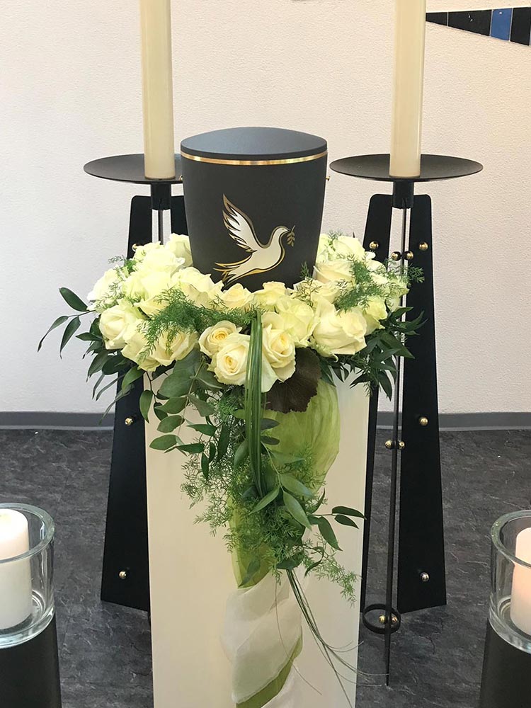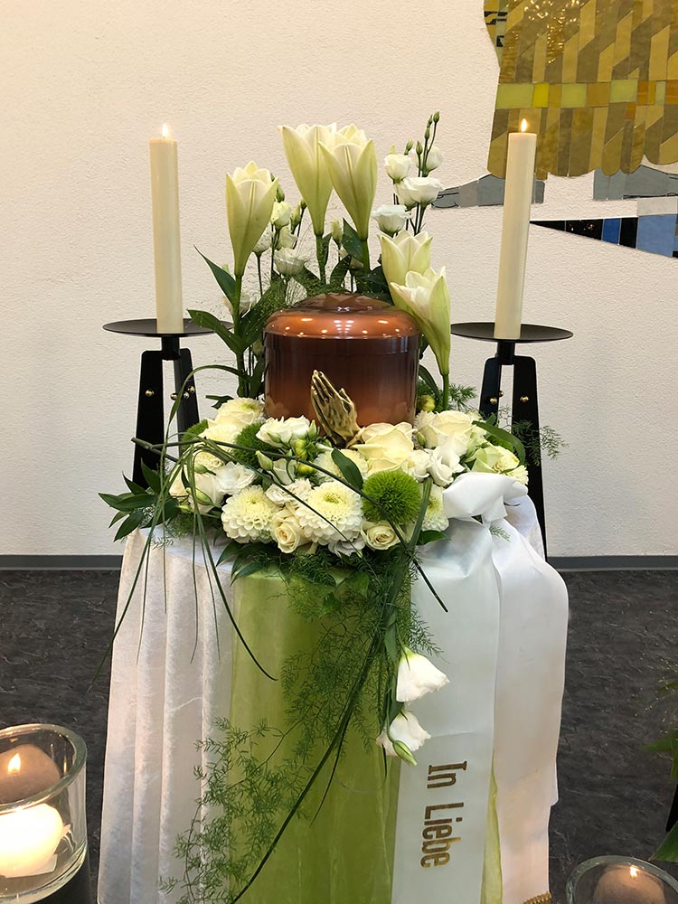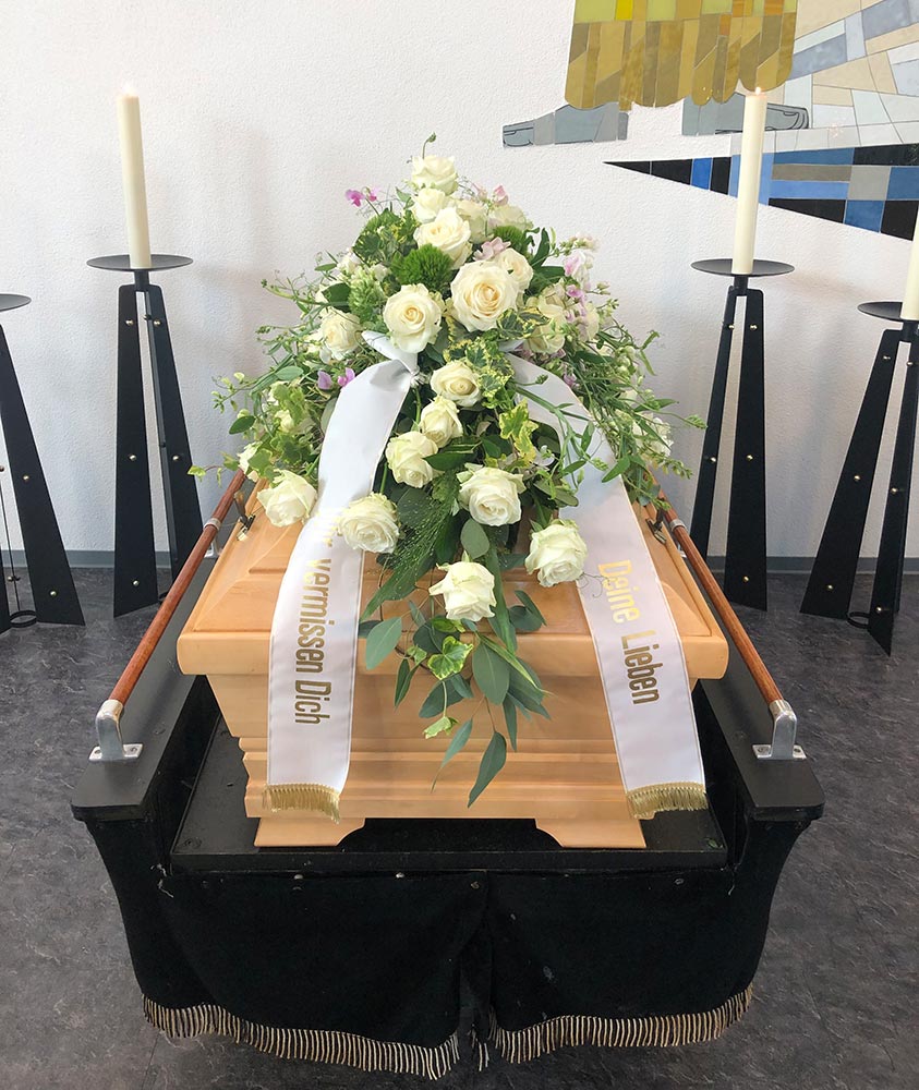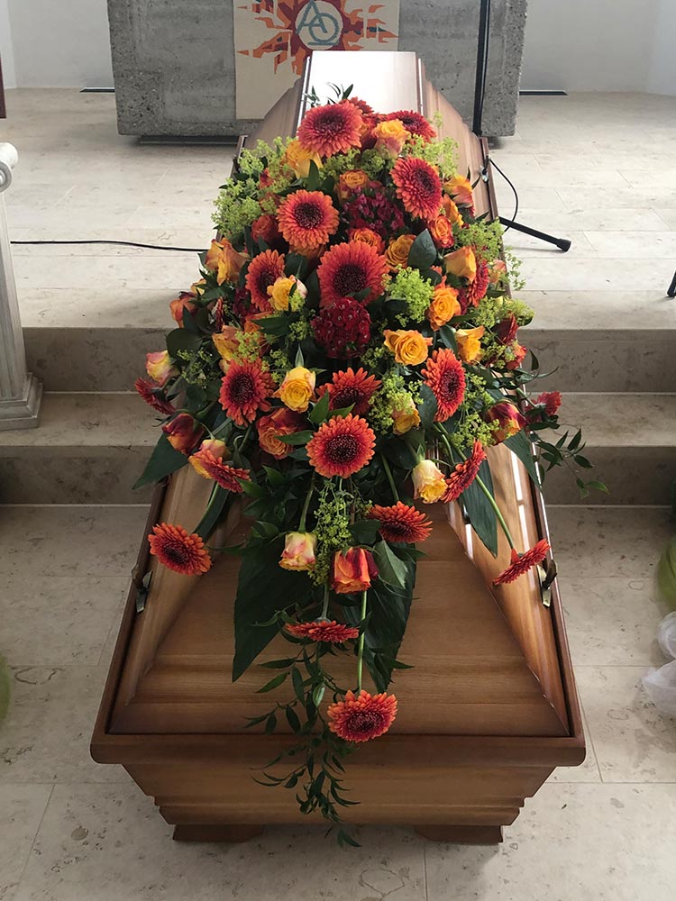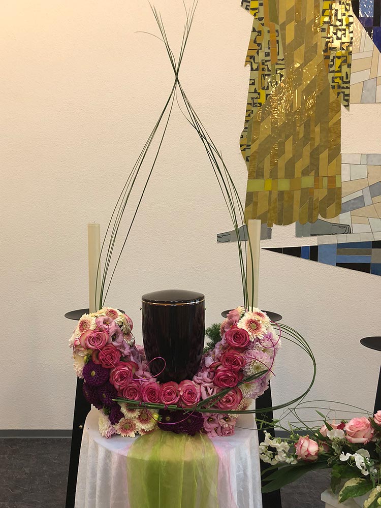 So individuell wie der Mensch, so sollte auch sein Abschied sein. Wir planen gemeinsam mit Ihnen die Dekoration für die Trauerfeier und helfen Ihnen bei der Auswahl und Besorgung von Trauerdekoration sowie Blumen und Kränzen. Dabei berücksichtigen wir Ihre ganz individuellen Wünsche. Trauer-Arrangements Zurück Weiter Zurück Weiter Sargschmuck Zurück Weiter Urnenschmuck Zurück Weiter Wir sind Tag & Nacht für Sie erreichbar Fon 07255 / 8559 Mobil 0176 64889120