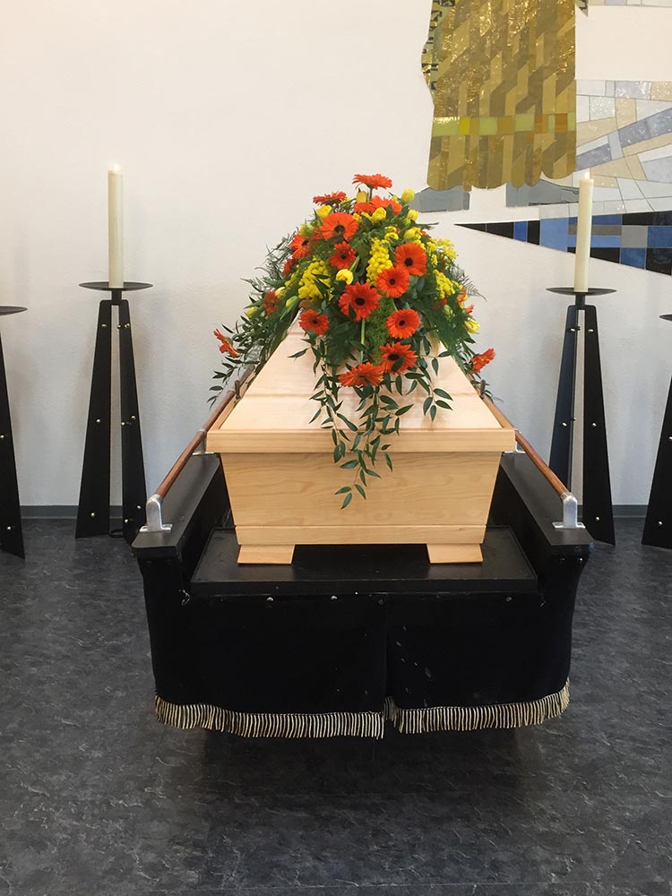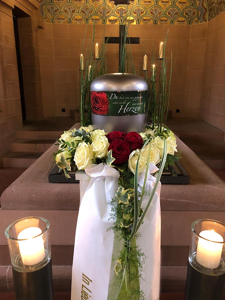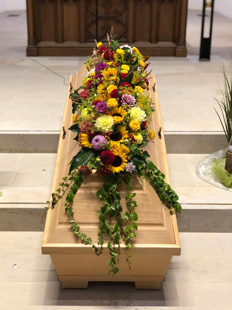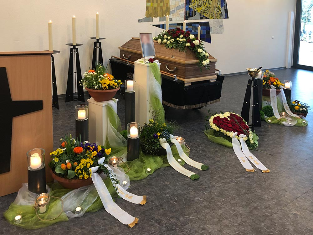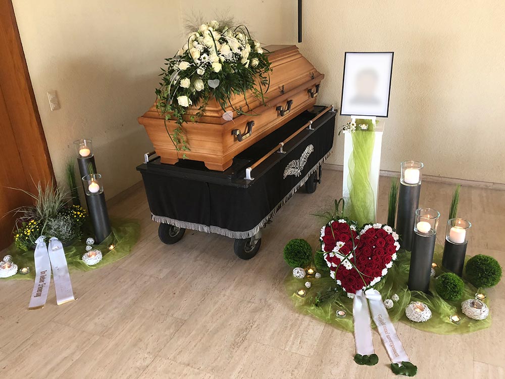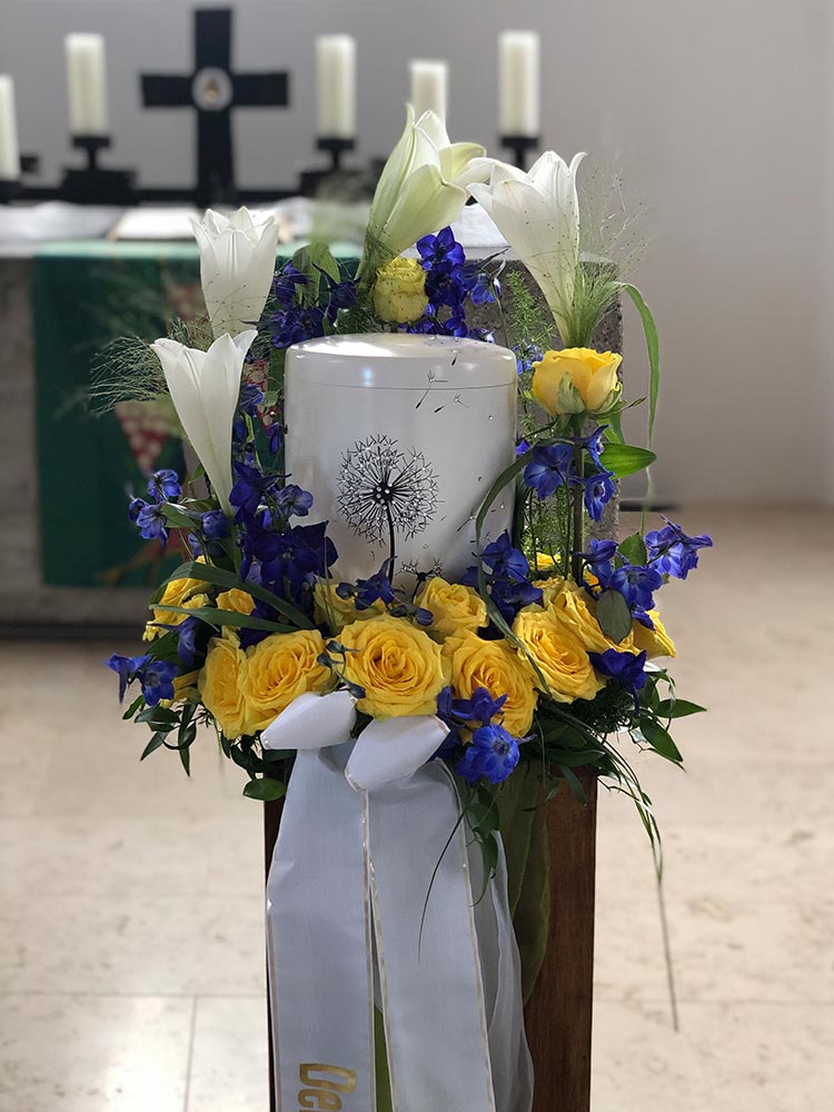 So individuell wie der Mensch, so sollte auch sein Abschied sein. Wir planen gemeinsam mit Ihnen die Dekoration für die Trauerfeier und helfen Ihnen bei der Auswahl und Besorgung von Trauerdekoration sowie Blumen und Kränzen. Dabei berücksichtigen wir Ihre ganz individuellen Wünsche. Trauer-Arrangements Zurück Weiter Zurück Weiter Sargschmuck Zurück Weiter Urnenschmuck Zurück Weiter Wir sind Tag & Nacht für Sie erreichbar Fon 07255 / 8559 Mobil 0176 64889120