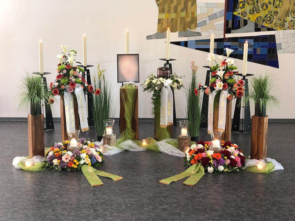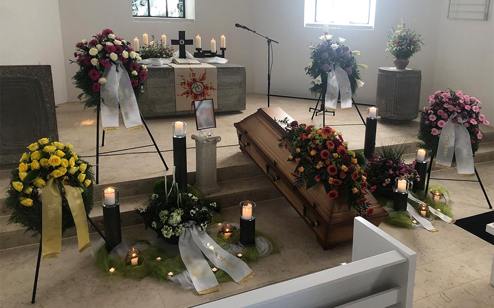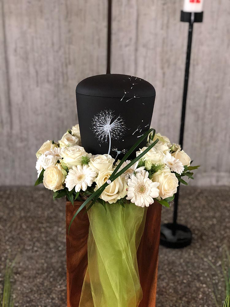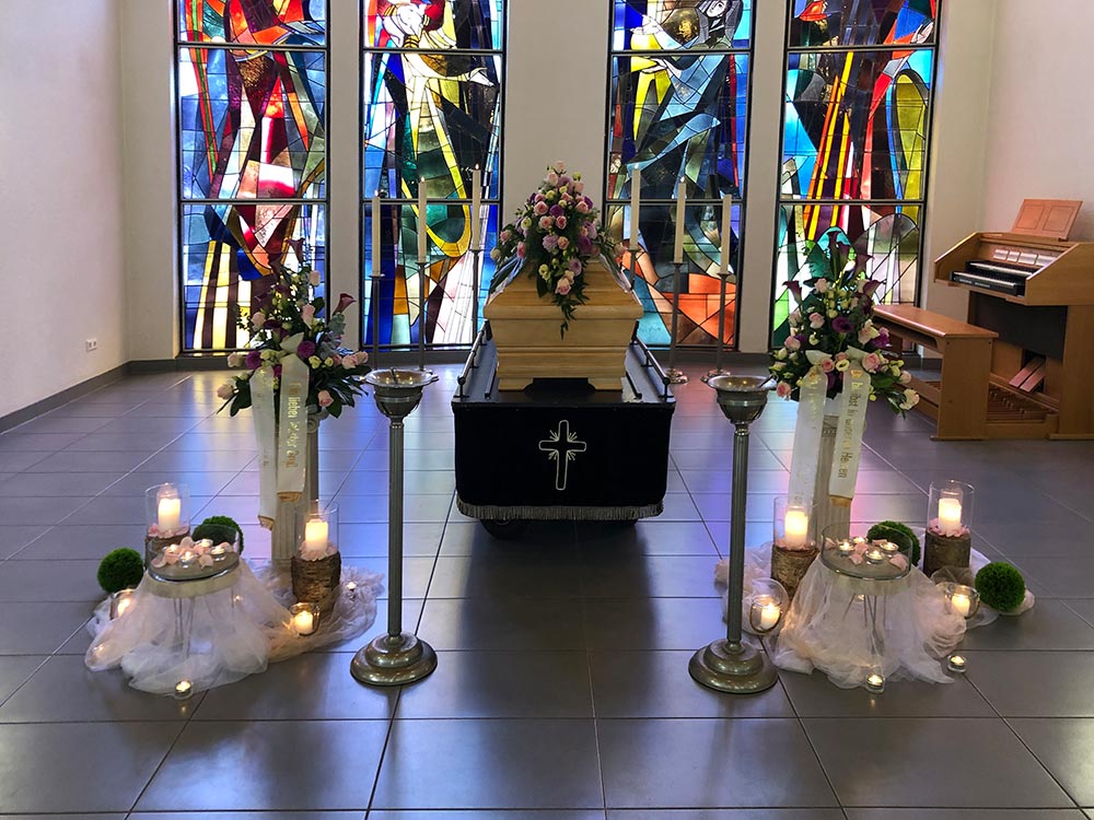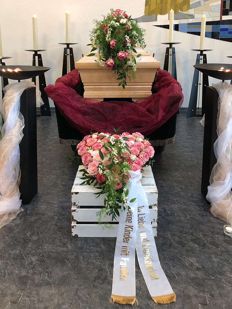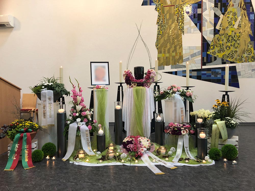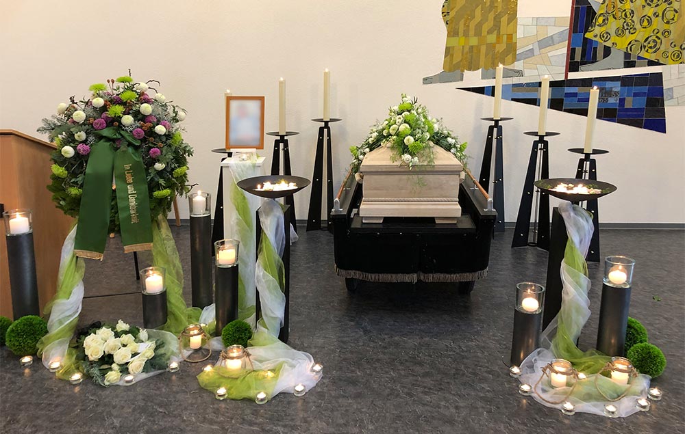 So individuell wie der Mensch, so sollte auch sein Abschied sein. Wir planen gemeinsam mit Ihnen die Dekoration für die Trauerfeier und helfen Ihnen bei der Auswahl und Besorgung von Trauerdekoration sowie Blumen und Kränzen. Dabei berücksichtigen wir Ihre ganz individuellen Wünsche. Trauer-Arrangements Zurück Weiter Zurück Weiter Sargschmuck Zurück Weiter Urnenschmuck Zurück Weiter Wir sind Tag & Nacht für Sie erreichbar Fon 07255 / 8559 Mobil 0176 64889120